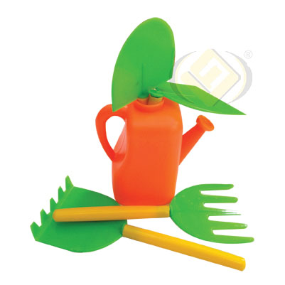 Bằng nhựa màu, gồm các dụng cụ:xẻng, bình tưới cây, bồ cào, cuốc,kích thước tối thiểu 1 chi tiết 35x35x35mm.